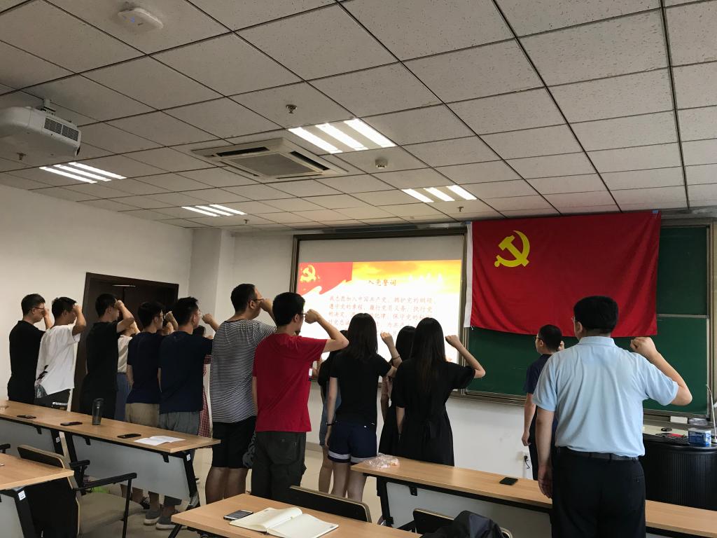 大会在雄壮的《国际歌》中拉开序幕,16名新党员面向鲜红的党旗,庄严地表达了自己的信仰,向党组织郑重宣誓,愿为共产主义奋斗终身。随后,2016级本科生方栋代表新党员作了发言,他汇报了自己一年多来的学习体会,坚信只有中国共产党的领导,才能带领中国人民实现中华民族伟大复兴的中国梦,表示今后要树立远大理想、练就过硬本领、担当时代责任、从严要求自己,积极发挥党员的先锋模范作用,无愧于共产党员的光荣称号。