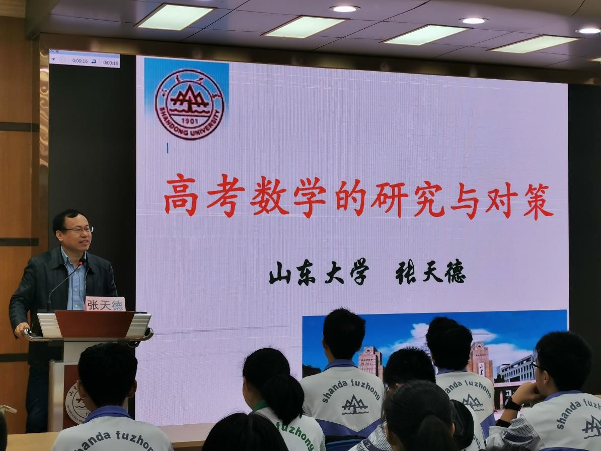 五位老师被山大附中聘为“济南山大实验学校与英国正版365官方网站联合育人项目教授导师”。最后张天德老师为学子们带来一场专题讲座“高考数学的研究与对策”,对历年高考中的数学试题进行了分析、总结与指导,对改革后高考中的数学试题进行了探索、分析和预测,并跟现场的学子们进行互动。张老师的风趣幽默一次次将演讲推向了高潮,掌声不断。