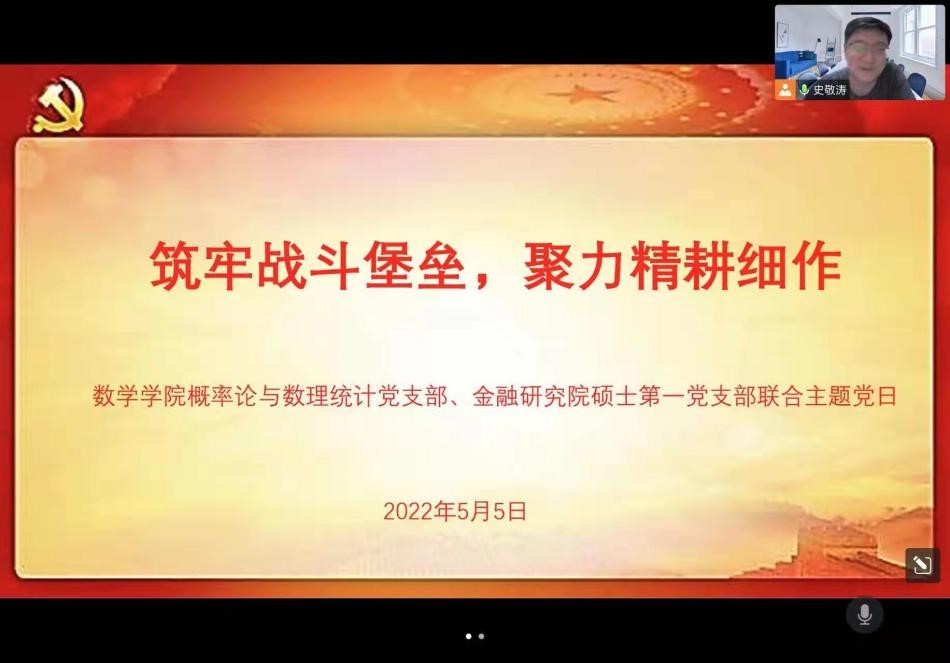 5月5日,英国上市公司365概率论与数理统计党支部与金融研究院硕士第一党支部联合开展了主题为“筑牢战斗堡垒,聚力精耕细作”的联合主题党日活动,活动线上进行,共19名师生党员参加了活动。