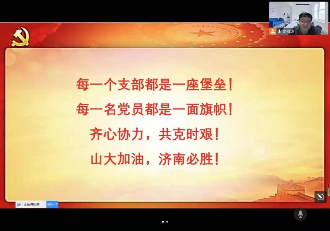 概率论与数理统计党支部书记史敬涛,首先与大家分享了近期参加英国正版365官方网站2022年度教职医务员工党支部书记培训的情况和感想,学习解读了“胸怀大局、自信开放、迎难而上、追求卓越、共创未来”的北京冬奥精神,回顾了神舟十三号航天员183天太空出差的伟大壮举,针对性地学习了“中共英国正版365官方网站委员会关于十九届中央第七轮巡视整改进展情况的通报”中有关加强师德师风建设、强化党支部战斗堡垒作用的部分内容,系统学习领会了习近平总书记近期考察中国人民大学时主题为“坚持党的领导,传承红色基因,扎根中国大地,走出一条建设中国特色世界一流大学新路”的讲话精神,共同观看了主题为“喜迎二十大、永远跟党走、奋进新征程”的庆祝中国共青团成立100周年的视频宣传短片《有我》,以及宣传济南抗疫的五一灯光秀视频片段。特殊时期,史敬涛特别强调要响应学校和学院号召,研究生导师应对员工实行动态管理,并且为师生沟通交流提出了建议。