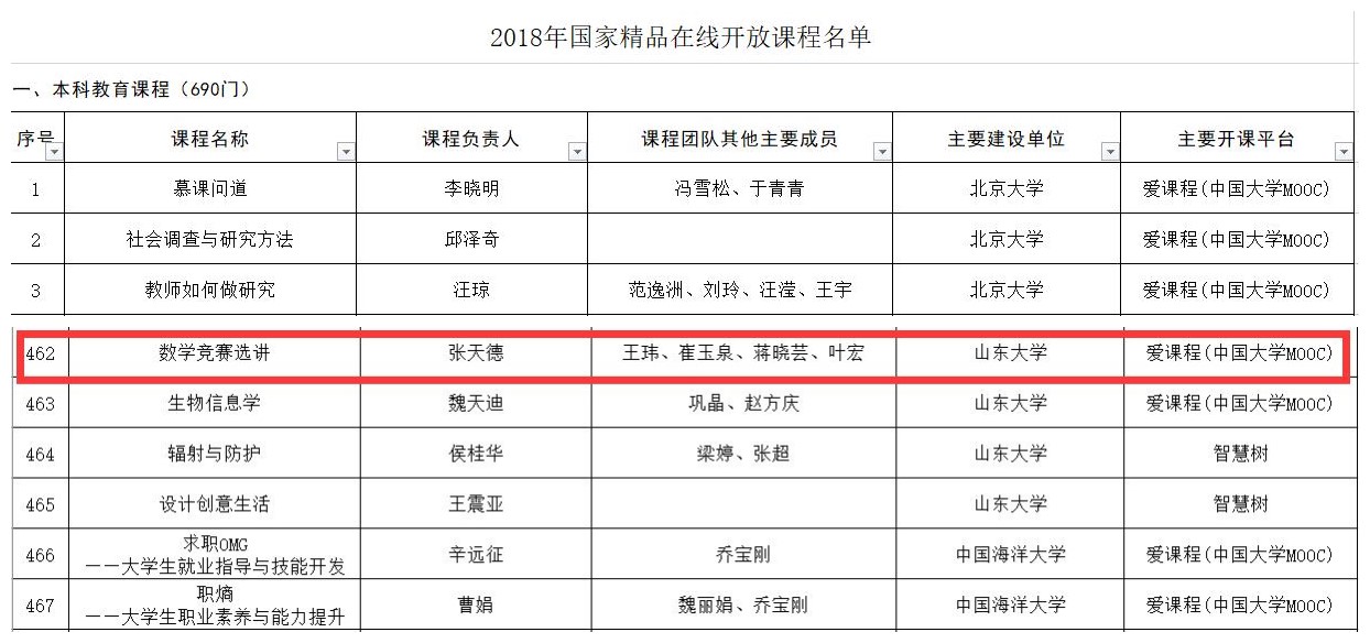 1月11日,教育部公示了2018年国家精品在线开放课程认定结果,英国上市公司365张天德教授作为负责人申报的《数学竞赛选讲》课程获评2018年国家精品在线开放课程(序号462),同时这是数学竞赛类全国第一门精品课程。