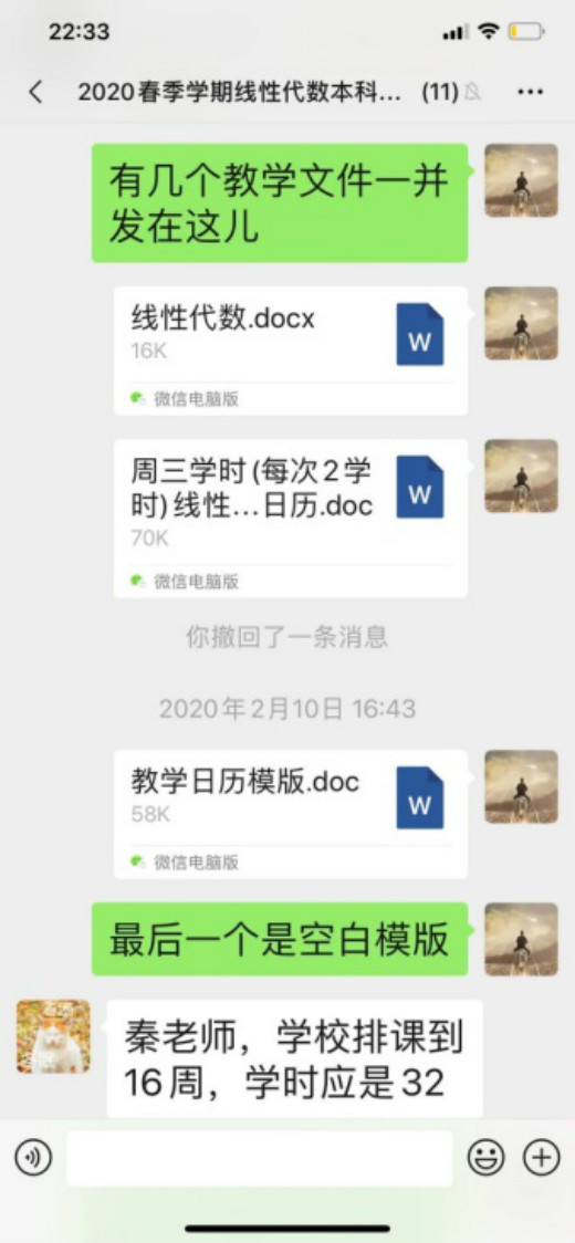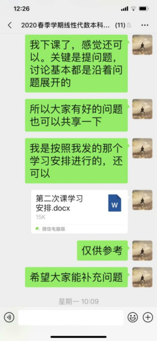 2月17日开学第一天,我的课是第1-2节,实话说心情有点复杂,有期盼也有点担心,一大早起来坐在电脑前,做好了一切准备,包括预案的第二套方案。7:50开始在微信员工群里发签到表格,感觉瞬间就签到完毕,看来师生都很期待。8:00按时上课,我首先语音介绍本次课的安排、主要学习内容等,约好讨论交流的时间,然后和员工一起观看教学视频。网络的卡顿成了主要问题,好在有第二预案,立即把学习强国上的课程链接发在员工群里,视频可以顺利看了。实际上,平台也很快解决了视频播放的卡顿问题。接下来的在线讨论交流,因为有预设的问题,开始讨论时,员工会首先回答这些问题,再进一步引出员工自己的问题,正因为这些预设的问题,又因为更多的是打字发表意见,课堂交流讨论比预期的要好很多,还可以使用@功能指定员工回答问题。课程结束后作了一个统计,全体同学都参与了交流,回答问题或提问题,最多的发言16次!