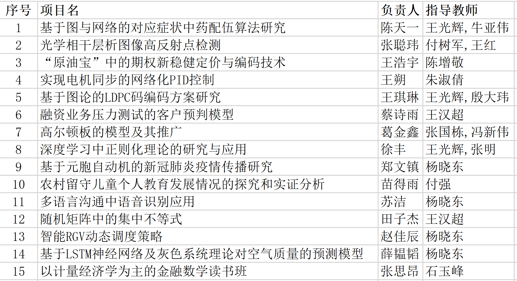 从本次科创立项的题目来看,有最新的热门社会问题,如“基于元胞自动机的新冠肺炎疫情传播研究”、“‘原油宝’中的期权新稳健定价与编码技术”、“农村留守儿童个人教育发展情况的探究和实证分析”、“融资业务压力测试的客户预判模型”等,有近年来的研究热点,如“基于图与网络的对应症状中药配伍算法研究”、 “深度学习中正则化理论的研究与应用”、“多语言沟通中语音识别应用”、“基于LSTM神经网络及灰色系统理论对空气质量的预测模型”、“光学相干层析图像高反射点检测”、“实现电机同步的网络化PID控制”等,有基于兴趣的纯数学问题,如“随机矩阵中的集中不等式”、“高尔顿板的模型及其推广”等,也有为夯实基础、开阔视野而开展的读书学习班,如“以计量经济学为主的金融数学读书班”等。选题类型多样,贴近社会热点,应用价值较高,充分展现出当代老员工既有“善其身”的钻研精神,又有“济天下”的家国情怀,体现出了一种积极向上的时代精神风貌。