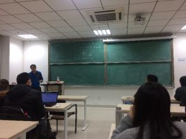 在此次报告中,吴河辉老师采用板书的形式给大家介绍了平均度条件下的图分解问题。首先,他由图分解的几个重要猜想作为引入,介绍了图分解的研究背景以及研究平均度条件下图分解的动机。接着,吴老师给大家详细讲解了平均度条件下图分解的证明过程:将原问题转化成规划模型,通过计算,找到0-1解,原问题解决。其中的计算过程非常复杂,但吴老师耐心地在黑板上给大家一步步推导。详细的推导过程让老师和同学们对该问题有了更深刻的印象,加深了对证明方法的理解。吴老师教导大家,对于复杂的计算,一定要耐心推导,其实很多灵感和想法都来源于计算过程。在提问环节,老师和同学们讨论热烈,吴老师一一解答了大家的疑问。最后,吴河辉老师还提出了一些未解决的问题以待研究。