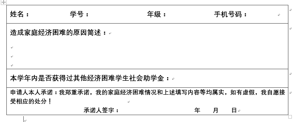 3、 经济困难员工本人据实认真填写申报表并签字(见附件),如申报内容不真实,将取消该生的申报资格;