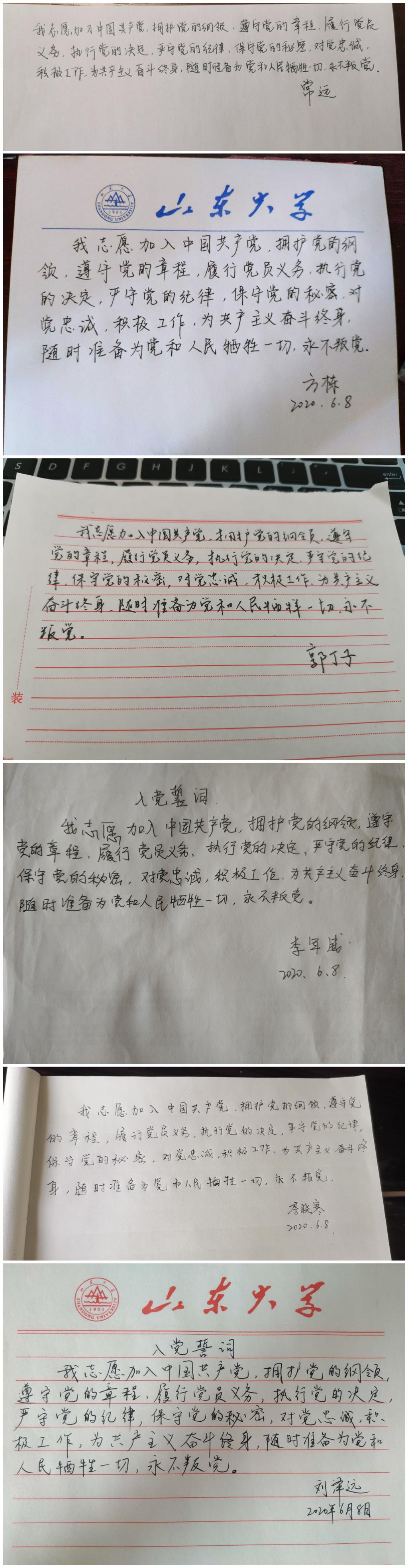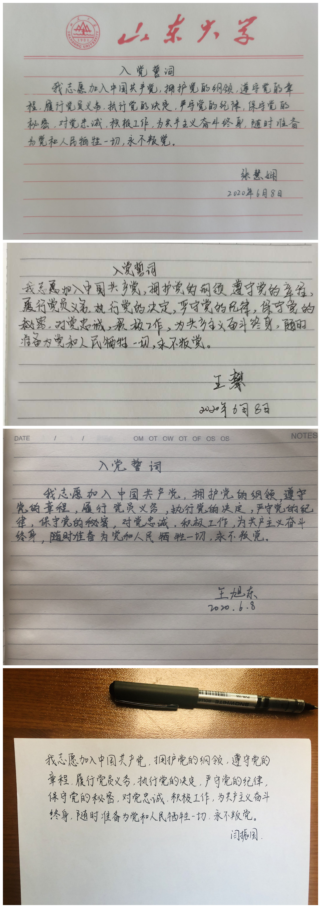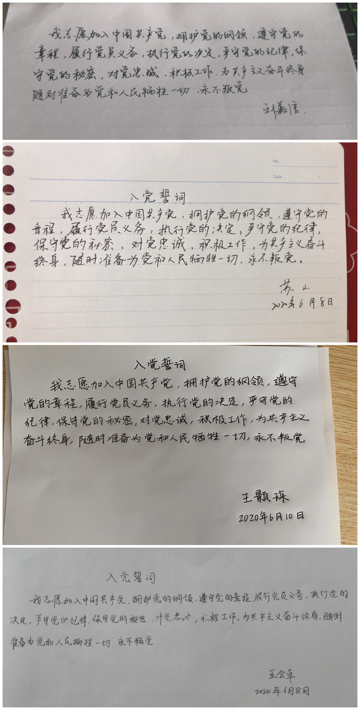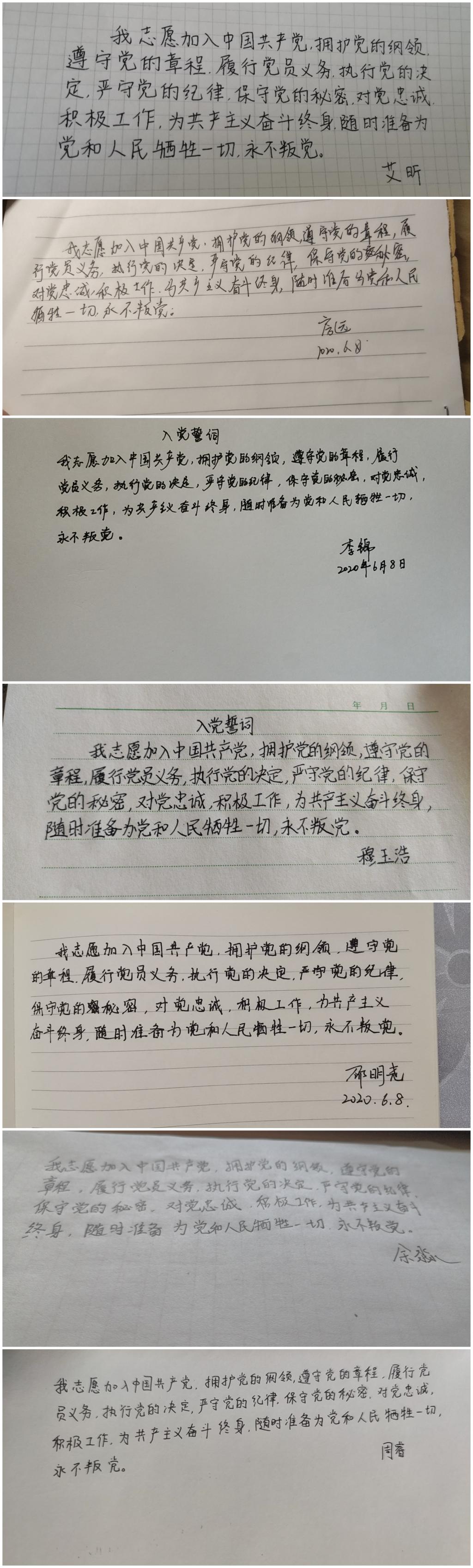 本科生党支部全体毕业生党员通过手抄入党誓词的方式,逐字逐句体悟入党初衷,铭记初心使命。结合自己的思想、工作和学习表现,将对党的承诺内化于心,外化于行。全体党员纷纷表示,通过此次手抄入党誓词活动,再一次重温了入党誓词,受到了一次深刻的党性洗礼,增强了组织观念和党性意识,将自觉践行入党誓词的每一句话,把责任和义务牢记于心,以实际行动争做一名“优秀党员”