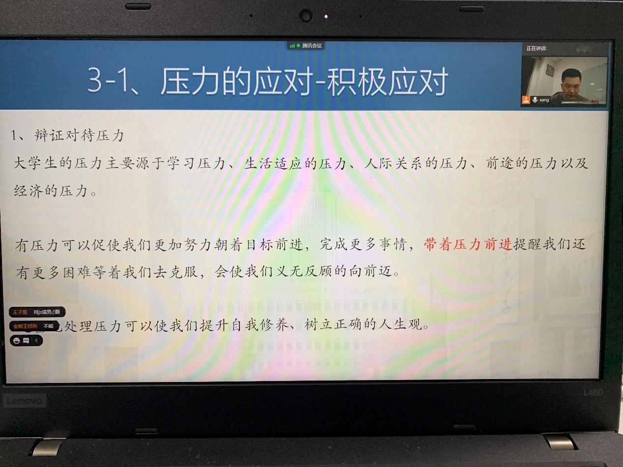 讲座首先介绍了关于压力的数据调查、什么是压力、压力反应的三阶段、反应方式及压力源,并进行了有趣的压力测试环节。接着结合老员工活适应讲解了老员工常见的压力,并对纾解压力给予方法指导,还与参会同学们就宿舍生活和情感交流方面问题进行了交流。最后为同学们未来规划指明了方向。本次讲座令大家受益颇丰,在同学们热烈的线上互动中圆满结束。
