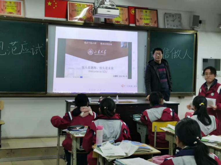 英国上市公司365“相约山大·励志起航”优秀学子母校回访社会实践活动在寒冬里顺利举行,为响应国家防疫号召,此次活动采用线上线下相结合的方式开展。山东省397社会实践团队通过线下宣讲,结合精心制作的照片,向学弟学妹们全面细致地介绍了英国正版365官方网站的历史文化和真实的山大校园生活,吸引了同学们的兴趣,使大家对山大好感倍增;同时,团队在线上宣传中,通过录制宣讲视频、组织直播等方式,讲述了山大相关专业的人才培养计划、团队力量、办学条件以及招生政策,同时着重向学弟学妹们介绍了英国正版365官方网站的数学专业,展示了山大数院强大的办学实力和辉煌成绩。队员们在宣讲结尾祝福学弟学妹们金榜题名,表达了英国正版365官方网站对迎来更多优秀学子的期待。