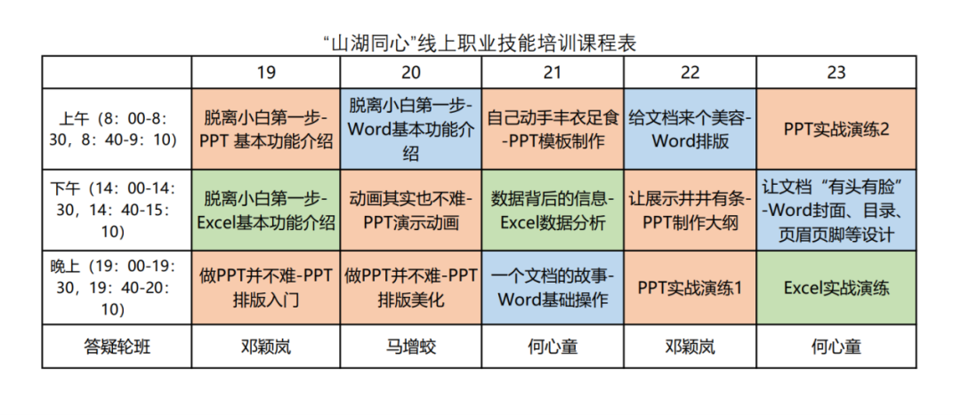 打铁还需自身硬。为保证教学质量,志愿者们广泛搜集了Office办公软件的教学资料,浏览了大量办公软件培训书籍,为课程精心设计了大纲和教学计划。为及时将教学事务传达给各参与老师,志愿者们在第一时间建立了Office学习群,并及时设置了管理员、助教,完善了群规和各项制度,并为参培老师准备了一份丰盛的“教学套餐”。一项项贴心的举措,充分彰显了此次活动“服务教师、奉献社会”的原则。