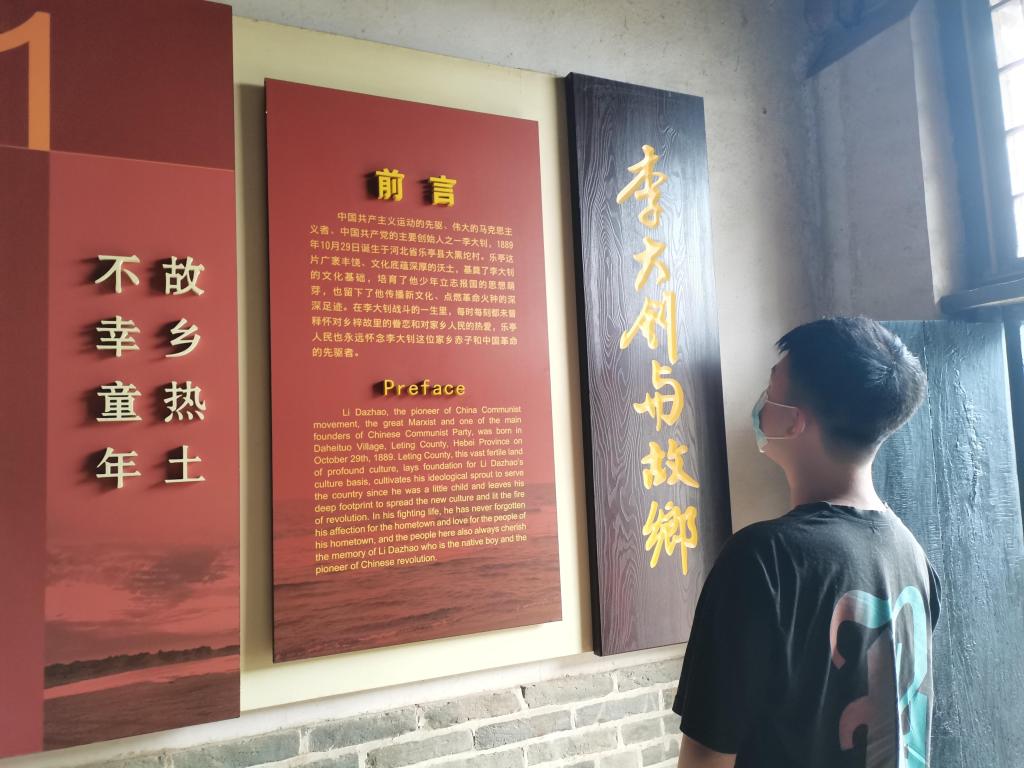 古老的砖墙,嘀嗒的雨声,历史与现实交错,仿佛一下子回到了那个艰苦奋斗的时代。走进李大钊故居的大门,直接映入眼帘的便是“我志愿加入中国共产党”的入党誓词。李大钊故居是其祖父于1881年修造的。这座宅院,是冀东农村典型的穿堂院形式。队员们一间屋子一间屋子地参观。锅灶、立柜、春凳、八仙桌……每一样物品的身上都存留着时间的印记,都在诉说着那段时光的不易。