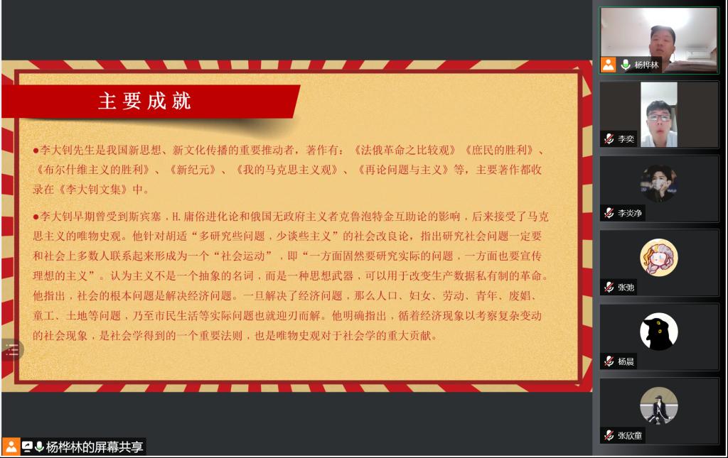 出于疫情防控的需要,团队将原本定在线下的李大钊革命精神宣讲改成了以线上腾讯会议的方式进行,邀请了包括来自李大钊母校唐山一中的学子在内的青年员工们参会。杨桦林同学分别从李大钊生平、主要成就和历史评价、李大钊名言录和李大钊精神四个方面进行了详细的介绍。