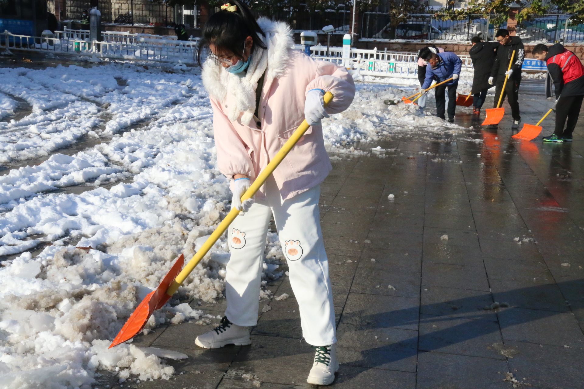 在大家的通力合作下,扫雪任务进展顺利,同学们不仅在规定的时间内完成了应有的任务,还额外清理了至圣路和大城广场的结冰。9时50分,宋金灿老师与同学们在图书馆前合影留念。