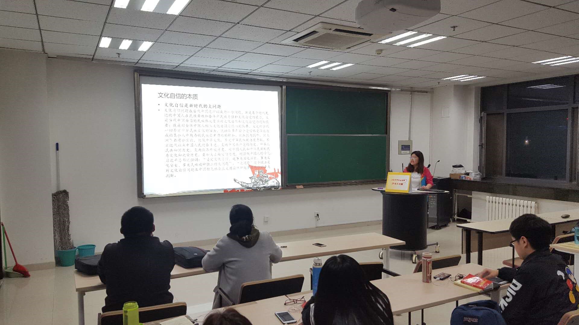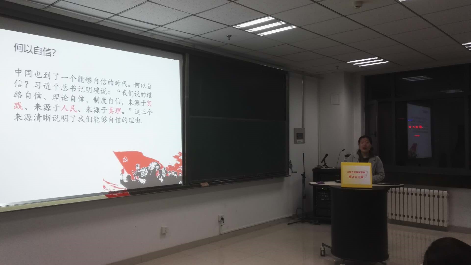 刘兆磊同学从制度自信的内涵、何以自信以及如何坚持制度自信进行介绍,从中国特色社会主义制度开始讲解,阐明了“四个自信”的关系,明确了中国特色社会主义制度的优势和特色以及如何坚持制度自信。