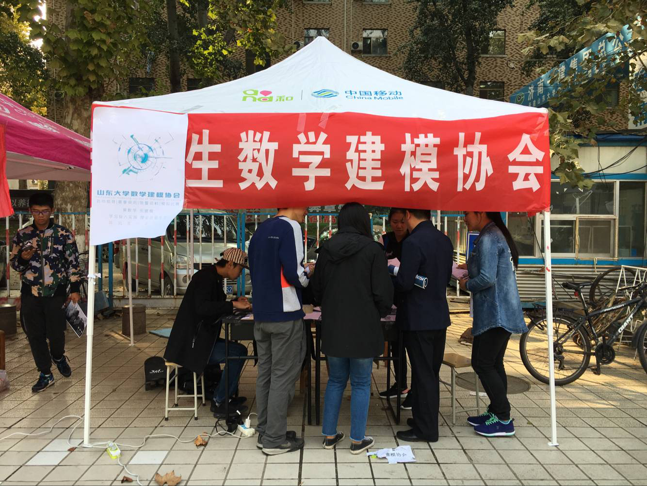 虽然今天是百团大战的第二天,天气也比前一天寒冷,来现场的同学不如前一天多,但建模协会还是凭借优秀的宣传、积极的态度、精品的活动吸引了很多新生,来报名的同学在展台前排起长队。这充分体现了数学建模协会作为山大唯一一个山东省优秀老员工科技社团的号召力,以及各类数模相关活动对同学们的吸引力。
