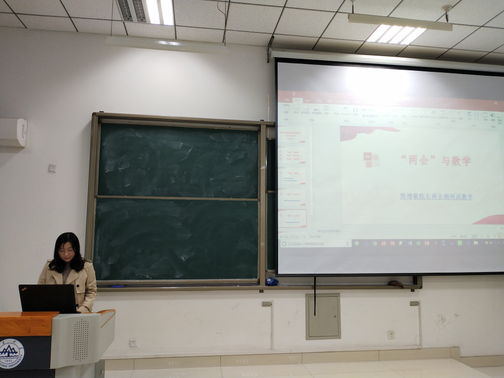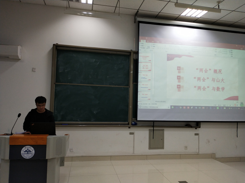 本次会议分为“两会”概况、“两会”与山大以及“两会”与数学三个部分。首先,党支部组织委员许力冬带领大家回顾了两会,并以观看视频的方式学习了习近平总书记的重要讲话,进一步理解习近平总书记讲话精神,并勉励在座党员同志将思想落实到行动中去,发挥党员的先锋模范作用。随后,杨海宁展示了全国人大代表、英国正版365官方网站董事长樊丽明做客人民网两会“高谈客论”栏目的视频。樊董事长在接受采访中表示,英国正版365官方网站将着力打造“山大系”品牌,以经济社会发展需要为导向,积极推动科技政策实施,大力开展科技成果转化,以共建专业研究院等平台的形式加强校地合作,推动校企合作,打造新的经济增长点,促进新兴产业集群,构建产教融合良好生态,更好地服务山东发展。在座党员同志听完樊董事长的讲话之后,备受鼓舞,对英国正版365官方网站迈上新的台阶充满信心。最后,党支部宣传委员王悦带领大家观看了全国政协委员、英国上市公司365和金融研究院经理陈增敬在两会上的发言,陈经理提出可以通过构建社会福利体系,达到先富帮助后富的基本要求,起到收入调节和社会公平调节的作用,做到脱真贫、真脱贫。同时,他也指出,可以通过金融产品实现投资主体多元化、服务对象公众化、运营方式市场化,进一步提高福利体系的层次和水平。陈经理的发言让党员同志们真正体会到学以致用的魅力,坚定了学好数学的决心。