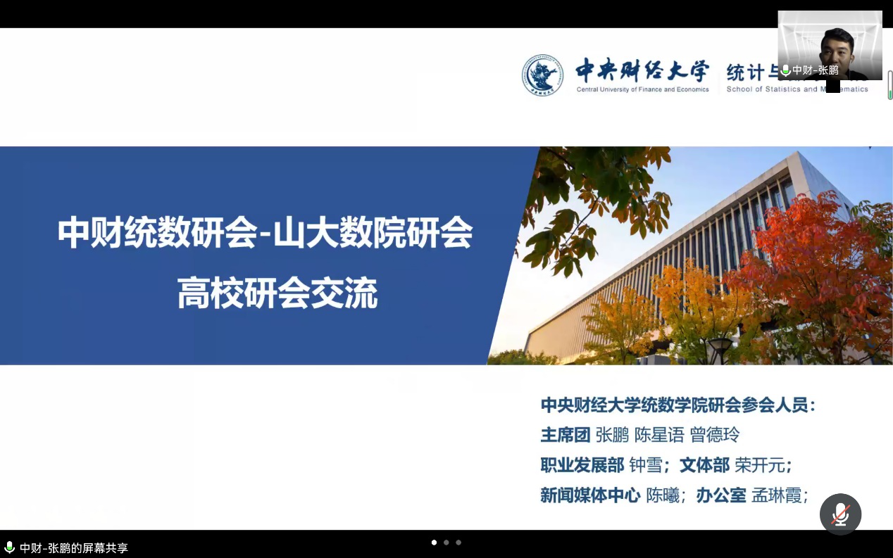 接着,中央财经大学统数研会代表张鹏介绍了其研会的构成及每个部门的基本职责,着重分享了为了维护学院数据安全研会成员所参加的有意义的活动,而后提出了其研会的主要工作方向以及对研会改革的构想。文体部部长荣开元分享了研会破冰、毕业晚会等活动的特色环节。职业发展部部长钟雪分享了广受同学们好评的讲座的相关策划,主要包含前期调研、联系嘉宾、表达诉求、听取建议、敲定主题等几个环节。参会代表们对员工资源获取及员工们的时间和意愿等问题进行了激烈的探讨。办公室部长孟林霞介绍了其主要工作内容包括物资购买、发票开具、活动复盘、资料整理总结与文字汇报等。新媒体部长陈曦阐述了其研会与山大组织的不同,他们与本科生员工会共同运营微信公众号“中财统数”,并在学院官网发布新闻和通知。之后,参会代表们就如何调动研会成员的积极性和参与感以及如何平衡日常活动与科研活动进行了思想的交流碰撞,对活动月“数学符号”的起名讨论了其蕴含意义,希望互相学习以办更有趣更吸引人的活动来丰富大家的研究生生活。