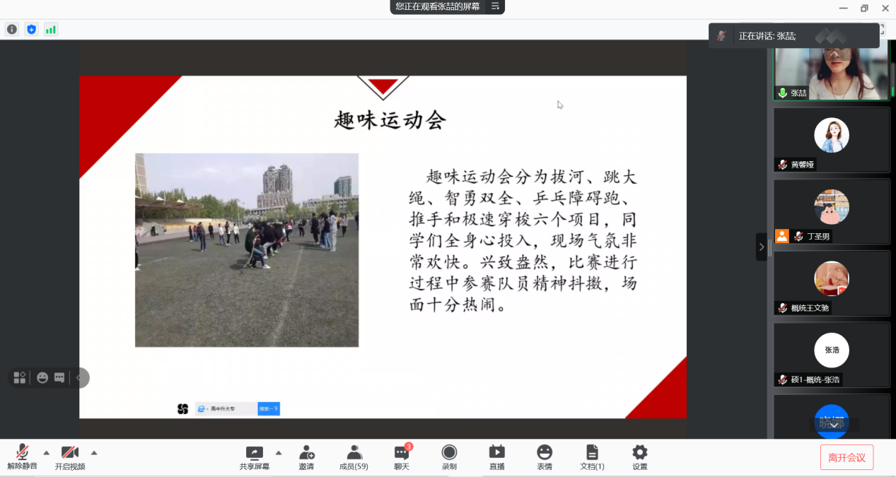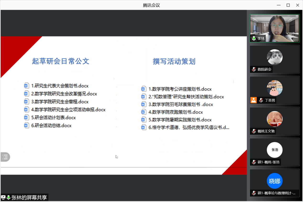 会议开始,主席团首先介绍了研究生会的组织架构,接下来各部门部长按照顺序依次进行部门宣讲。首先进行部门宣讲的是学术部部长荣腾,她向我们展示了学术部的主要工作内容,例如举办学术报告、讲座以及董事长奖学金获得者的采访等。接下来,办公室部长张林介绍了办公室的日常工作,最主要的就是起草研会日常公文、撰写活动策划和文档管理,通过这些工作可以收获满满。