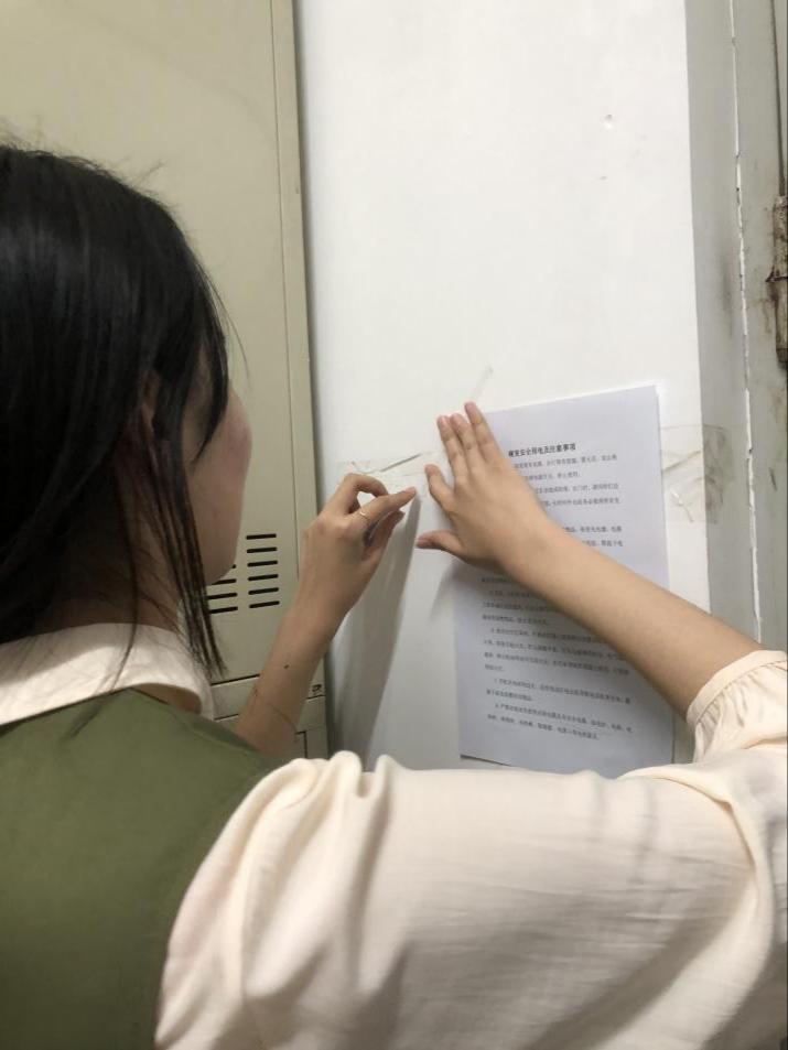 在走访过程中,研会成员针对是否安全用电、有无违章电器等情况进行了仔细排查,重点检查了是否有使用大功率电器、出门未拔电源插头、桌面线头混乱等容易被忽视的问题,如有发现,及时提出并当面督导整改。同时研会成员向同学们提出了宿舍安全用电的注意事项,告诉大家在使用电脑插座、接线板等用电设备时,要注意定期通风防潮、让电器适当断电休息。成员们还叮嘱同学们禁止使用违规电器、长时间出门时要关掉插排电源。最后,研会为每个寝室张贴了用电须知,提醒同学们注意防范各种安全隐患。