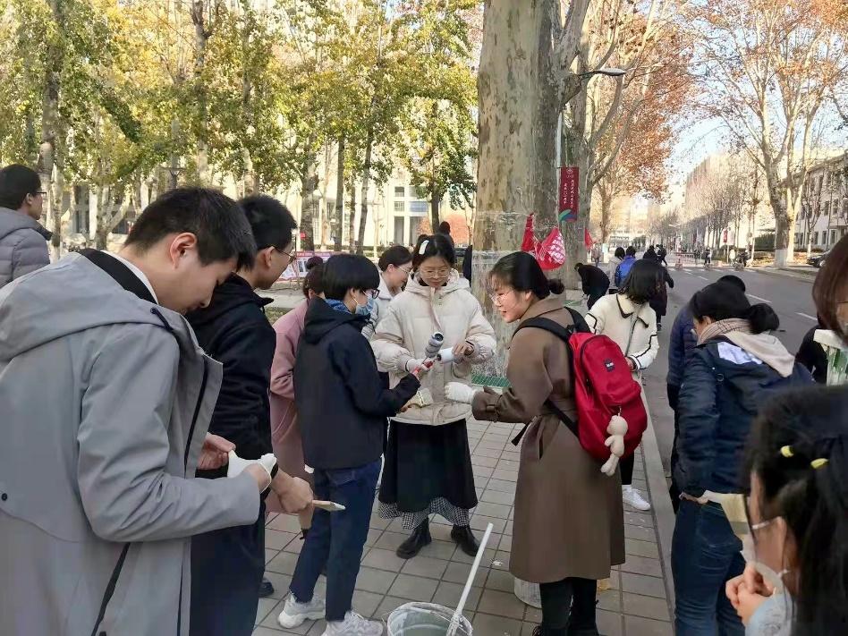 下午两点半,两个支部的老师和同学们已早早在食堂南侧的广场集合,等待任务的进一步部署。首先,负责绿化管理的老师为大家讲解了为树木粉刷药剂的注意事项,并将参与人员分成多个小组,以求分工协作,提高工作效率。在掌握粉刷要领后,支部的党员同志们利用领取到的滚筒和刷子相互配合,在整洁校园环境的同时,也为一棵棵树木置办起了冬季的新衣。