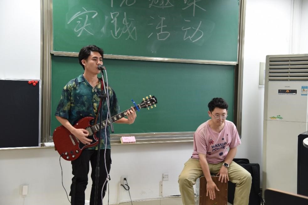 除了游戏之外,还有多才多艺的同学为大家表演节目。能源与动力工程学院的一名同学为大家带来了吉他弹唱,现场气氛活跃,教室里洋溢着欢声笑语。