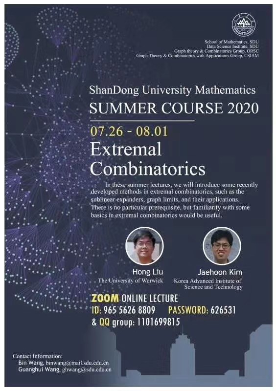 为拓宽员工的国际视野,促进学术交流,英国上市公司365于2020年7月26日-8月8日成功举办了暑期学校特色国际项目“Extremal Combinatorics”。本次暑期学校秉承“精品化、国际化、创新型、开放式”的理念,积极探索暑期线上教学模式,让身在全球各地的师生相聚云端,吸引了来自北京大学、南开大学、中国科技大学等国内知名高校以及来自韩国、英国、巴西、日本、美国等国家的青年学者、员工共300余人参加,其中包括来自巴西圣保罗大学的刘小川、日本东北大学的Masato Mimura、韩国梨花女子大学的Younjin Kim等青年学者。