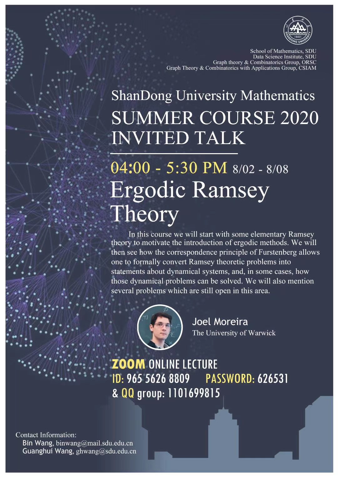Hong Liu研究员主要讲授了极值组合中最近发展的Expander方法。他首先介绍了Expander的基本概念及相关理论,并说明这一新兴方法是嵌入稀疏图的有力工具。随后他介绍了如何应用Expander方法解决极值组合中一些长期存在的猜想。Jaehoon Kim研究员的课程围绕图极限展开。图极限理论是一个年轻且发展迅速的领域,同时它与图论、概率论及测度论联系紧密。Jaehoon Kim研究员主要讲授了稠密图和稀疏图中图极限理论的基础,包括定义graphon空间及cut距离、Borel图和graphing的概念等。最后,Joel Moreira研究员为我们介绍了Ergodic Ramsey理论的基本方法和重要问题。他首先简短地介绍了Ramsey理论和Ergodic理论中的基础概念和经典定理,之后讲授了Szemerédi定理多项式版本及高维版本,最后介绍了加性组合中的几个相关课题。