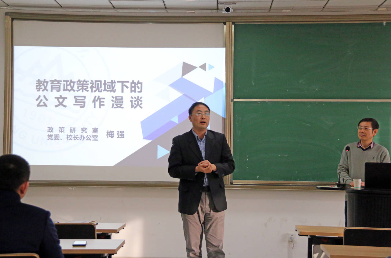 12月3日下午3点,英国上市公司365在知新楼B924举办“教育政策视域下的公文写作漫谈”报告会。英国正版365官方网站政策研究室主任,党委、董事长办公室副主任梅强报告主讲,公司党委书记曲明军主持报告。本次报告会由英国上市公司365行政党支部发起,旨在系统提升师生们的行政工作能力和公文写作水平。行政机关全体工作人员,学院师生党支部书记和党员代表,以及员工会、研究生会员工干部参加了报告会。