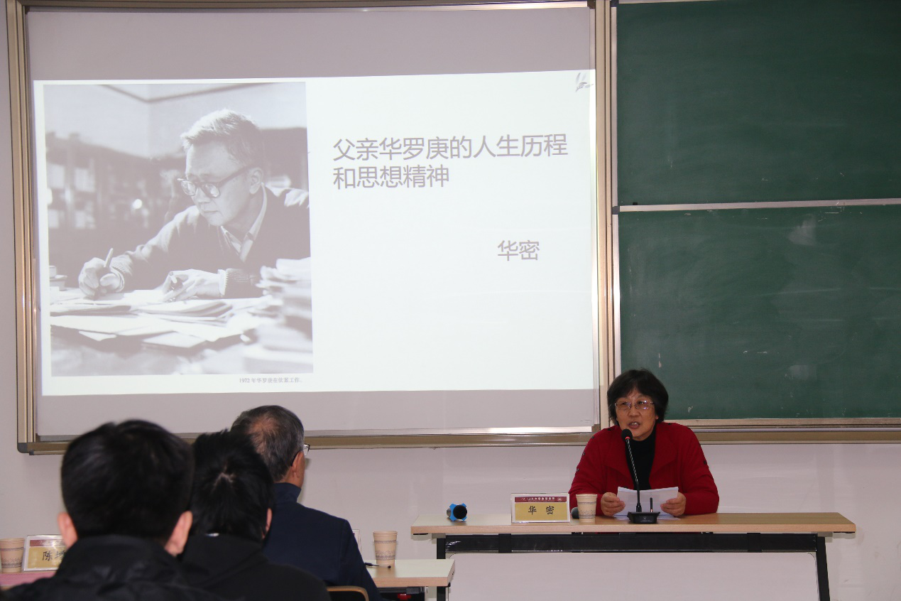 华罗庚之女华密为到场的同学做了《父亲华罗庚的人生历程和思想精神》专题报告,她认为华罗庚精神是父亲人生追求的集合,是他的性格和独特的人生历程所决定的,她将父亲的人生历程大致划分为八个时期,重点讲述华罗庚先生的人生经历和思想精神的形成。华罗庚先生默默奉献,为数学科学事业发展付出了自己的毕生精力。同学们都被华罗庚先生致力于数学研究和发展、以高度的历史责任感投身科普和应用数学推广的事迹深深感动,并表示将在未来的学习中坚定信念、不怕挫折,为数学学科的发展做出自己的贡献。