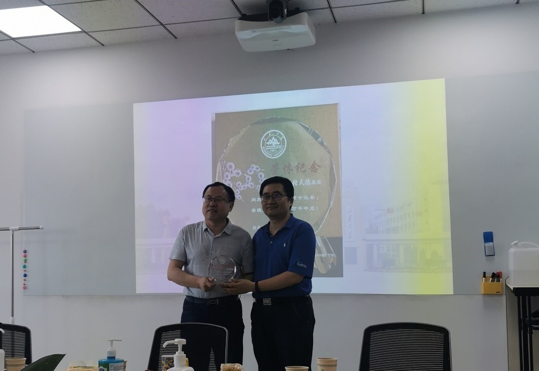 科学计算与软件研究所为张天德教授赶制了荣休纪念水晶杯,水晶杯中镶嵌的语句“问天求索,笔耕百十长卷; 崇德尚行,教化万千中坚!” 完美地总结了张天德教授工作中的成就,由才女李晓丽教授为张天德教授量身创作。研究所所长杜宁教授给张天德教授颁发了纪念杯。