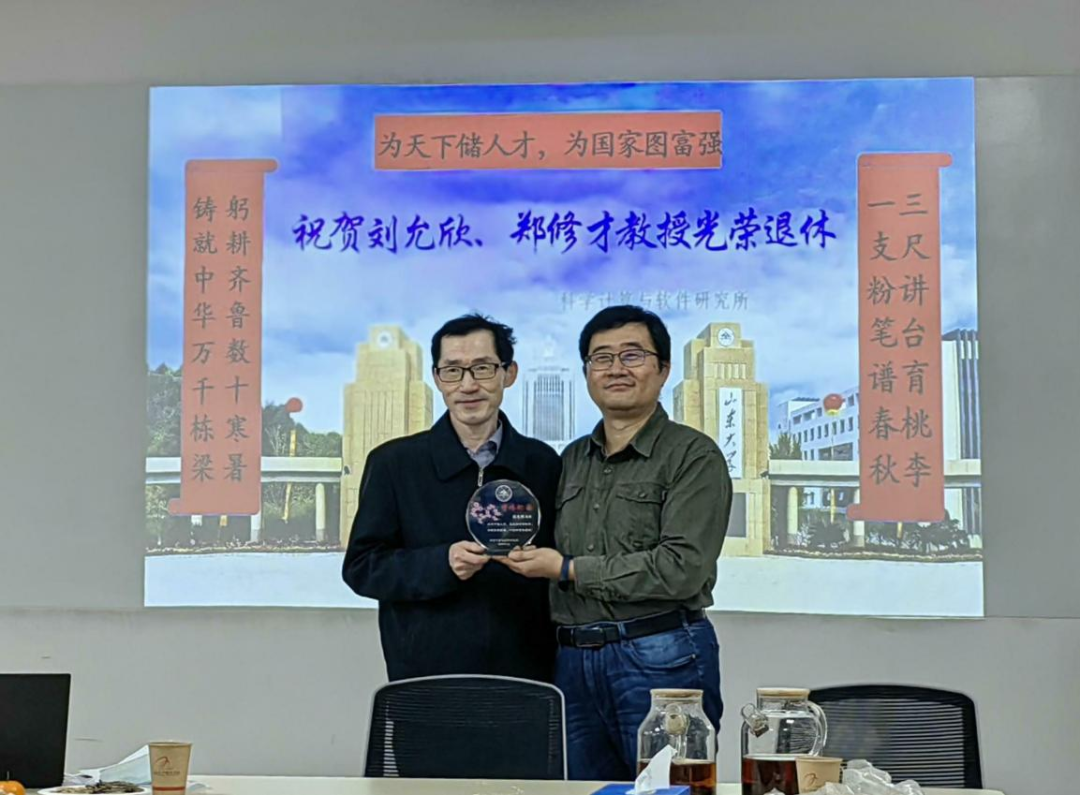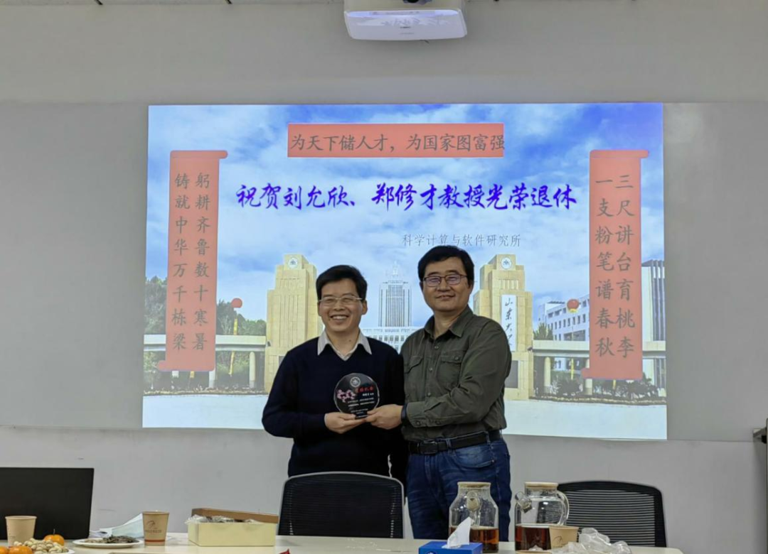 科学计算与软件研究所为刘允欣、郑修才定制了荣休纪念水晶杯,纪念杯中镶嵌的语句“为天下储人才,三尺讲台育桃李;为国家图富强,一支粉笔谱春秋!”“为天下储人才,躬耕齐鲁数十寒暑;为国家图富强,铸就中华万千栋梁!”完美地总结了刘允欣、郑修才两位教授工作中的成就。研究所所长杜宁教授向两位教授颁发了纪念杯。