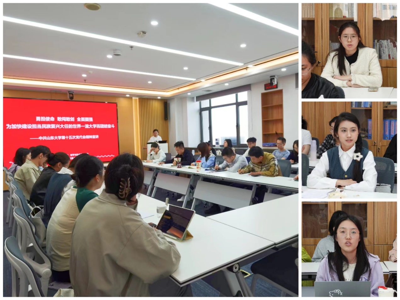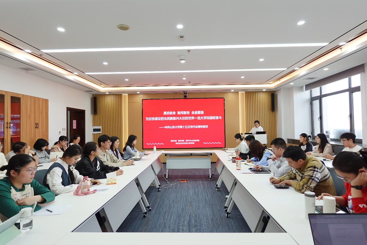 在讨论环节,王自然以如何“勇担使命、敢闯敢创”、如何将国家重大战略融合到自己的学术目标中、员工党员如何贯彻落实党代会精神等方面进行了提问。她强调,各位党员同志要结合自身经历,从不同角度、以不同身份理解体会学校第十五次党代会报告擘画的宏伟蓝图,将个人发展与学校发展、国家发展有机结合在一起,抢抓机遇、全面图强,加快学校“双一流”建设做出自己的贡献。戚学儒认为,青年是国家和民族的希望,是山大的未来,学校第十五次党代会与每一位党员同志、每一位师生医务员工息息相关。希望在座同学们务必不忘初心、牢记使命,务必谦虚谨慎、艰苦奋斗,务必敢于斗争、善于斗争,弘扬党的光荣传统和优良作风,不断增强做中国人的志气、骨气、底气,奋力书写为中国式现代化挺膺担当的青春篇章。期间,与会党员聚焦学习内容,结合自身实际提出了问题,各位老师进行详细解答。