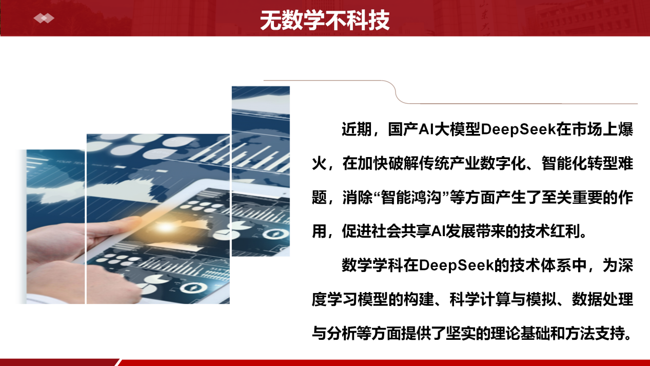 突出数智赋能,培育时代新人。瞄准世界科技前沿和国家重大战略需求,加快数学拔尖创新人才培养,推进人工智能赋能教育管理改革。突出“学科驱动”,开学各类专业课中强调数学学科尤其是在DeepSeek的技术体系中,为深度学习模型的构建、科学计算与模拟、数据处理与分析等方面提供了坚实的理论基础和方法支持,鼓励员工在基础学科领域大胆发问、善于思考、勇于探索。构筑全面学习氛围,形成“分管领导带头学、辅导员全面学、员工深度学”的数智教育,结合教育管理日常工作和学校对于DeepSeek软件应用开发效能,加强对新工具、新业态、新方式的应用,促进员工不断成为全面发展的时代新人。