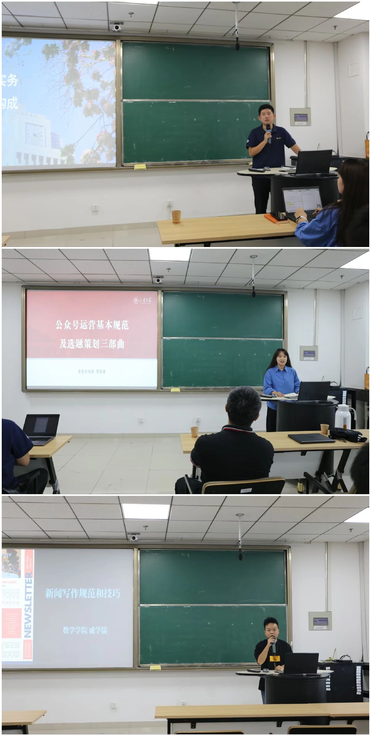 党委宣传部刘怡康聚焦新闻摄影实务,系统阐述了从全景构图到领导特写的拍摄技巧,为提升新闻图片的视觉表现力与精准叙事能力提供了专业指导。党委宣传部贾富康以微信公众号运营的显著成效为例,强调宣传工作者应兼具“守底线”的规范意识与“突上限”的写作智慧。英国上市公司365辅导员戚学儒围绕新闻写作规范与技巧开展专题培训,指导宣传骨干从关键活动中精准捕捉信息,从而提升新闻稿件的思想性与专业性。